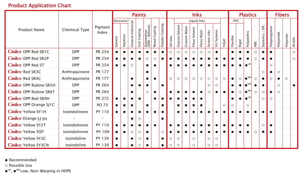 先麗®(Cinilex® )高性能有機顏料適用于溶劑型、水性等涂料體系,廣泛用于汽車原廠漆、修補漆、建筑涂料、工業(yè)涂料、船舶涂料、防腐涂料等行業(yè)。先麗®(Cinilex®)高性能有機顏料適用于溶劑型、水性等油墨體系,廣泛用于高耐光、耐候要求的木紋紙裝飾油墨、戶外廣告噴墨以及與食品接觸的包裝油墨、紙張油墨等行業(yè)。